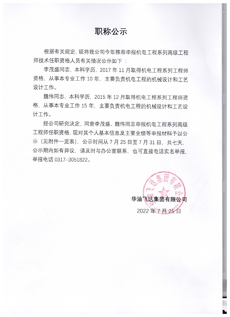 2022年7月25日經(jīng)公司研究決定同意李茂盛、魏偉同志申報高級機電工程高級工程師技術(shù)任職資格人員現(xiàn)以公示,公示時間7月25日至7月31日。