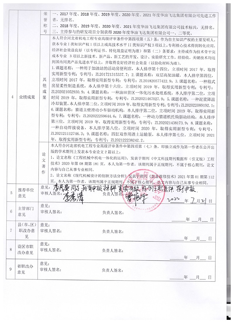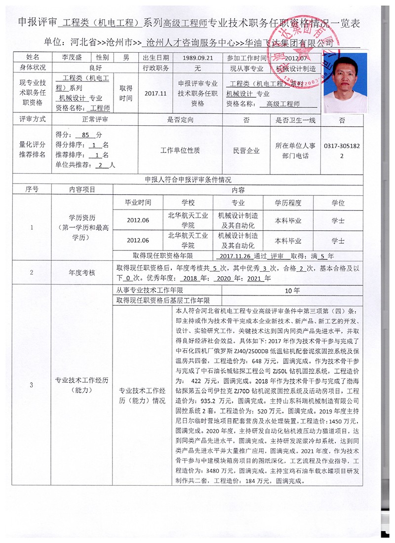 我公司推薦李茂盛和魏偉同志申報高級機電工程高級工程師技術(shù)任職資格人員